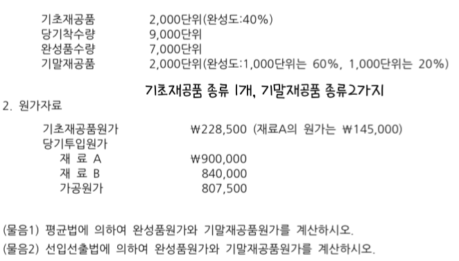 | 기말재공품: (1)(0)(0.8), (1)(0)(0.6) | 재료원가완성도 A: (1), B:(0) |