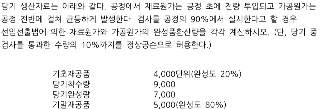 정상, 비정상공손 수량 공정 50% 상태에서 검사통과수량: 8000개 기초재공품 2000개 + 당기투입 5000개 + 기말 1000개 ∴ 정상공손품 수량 800개, 비정상공손품 수량 1200개 |