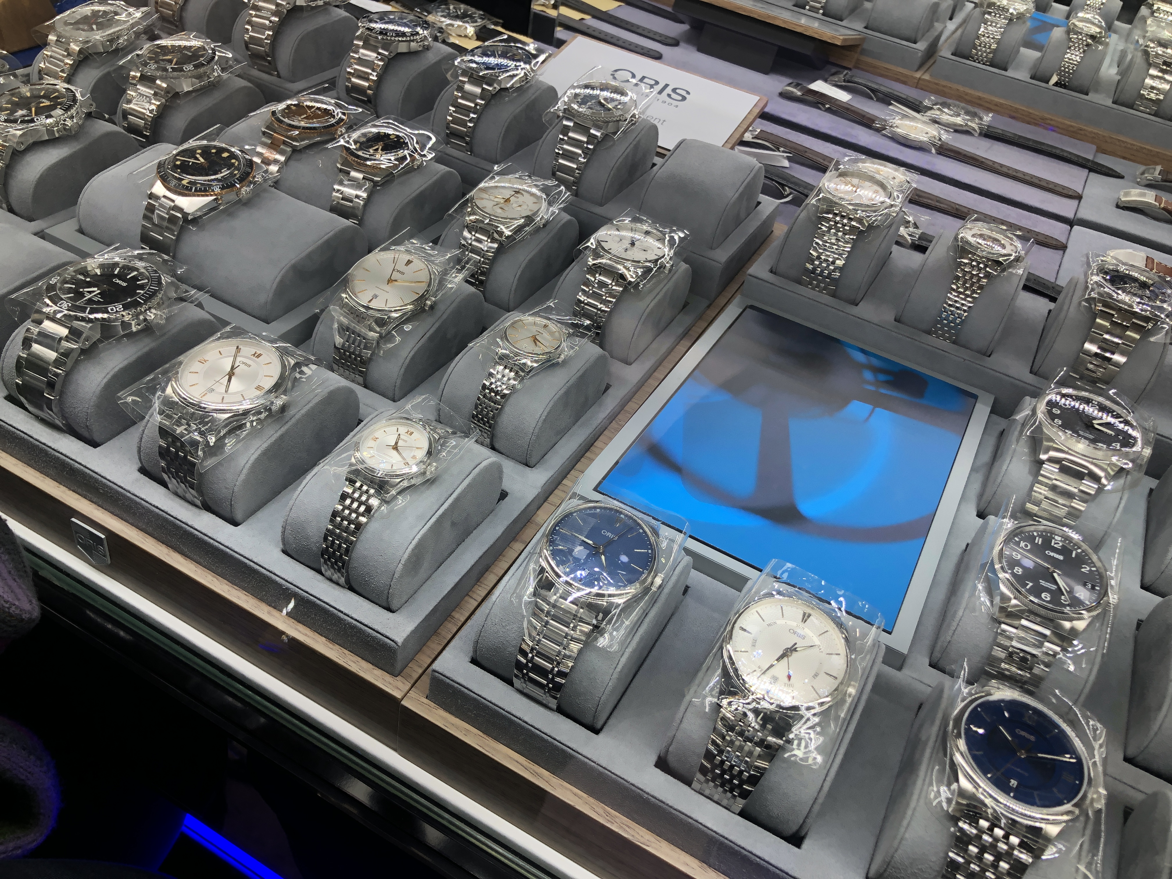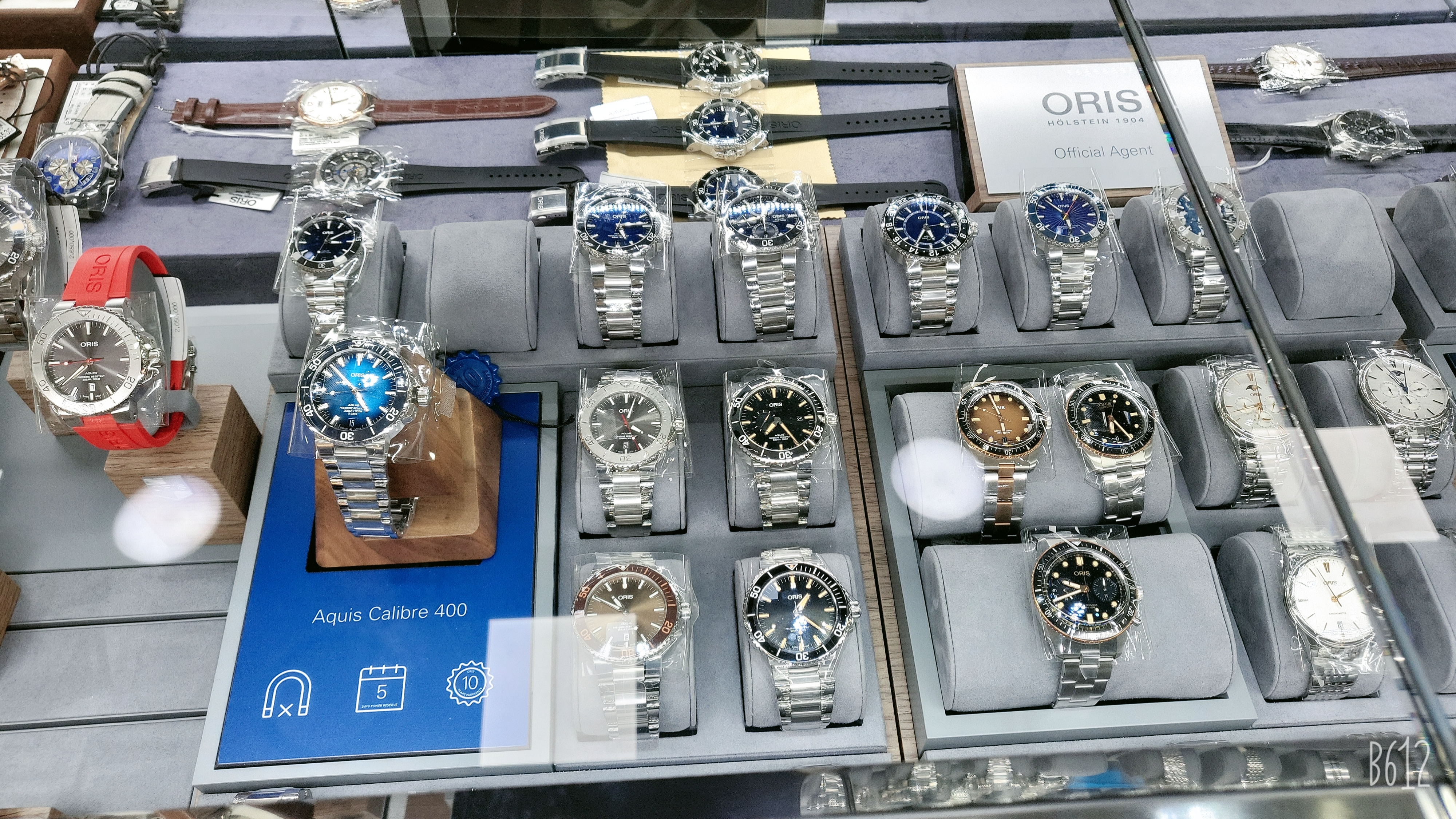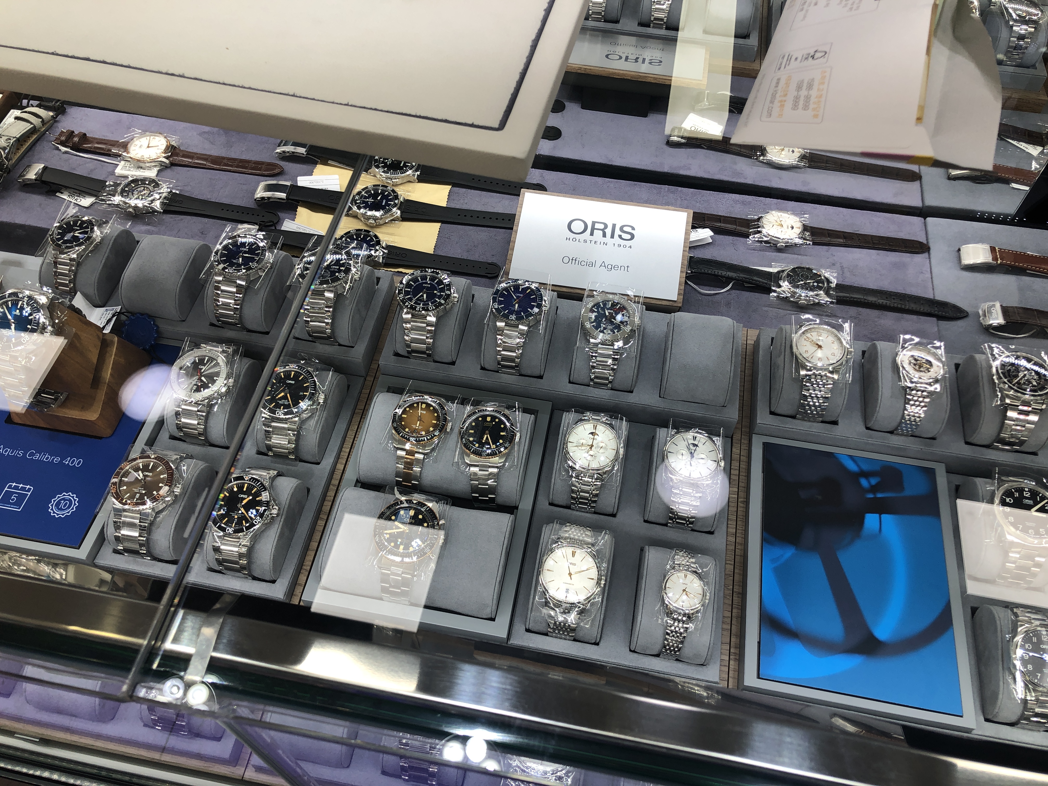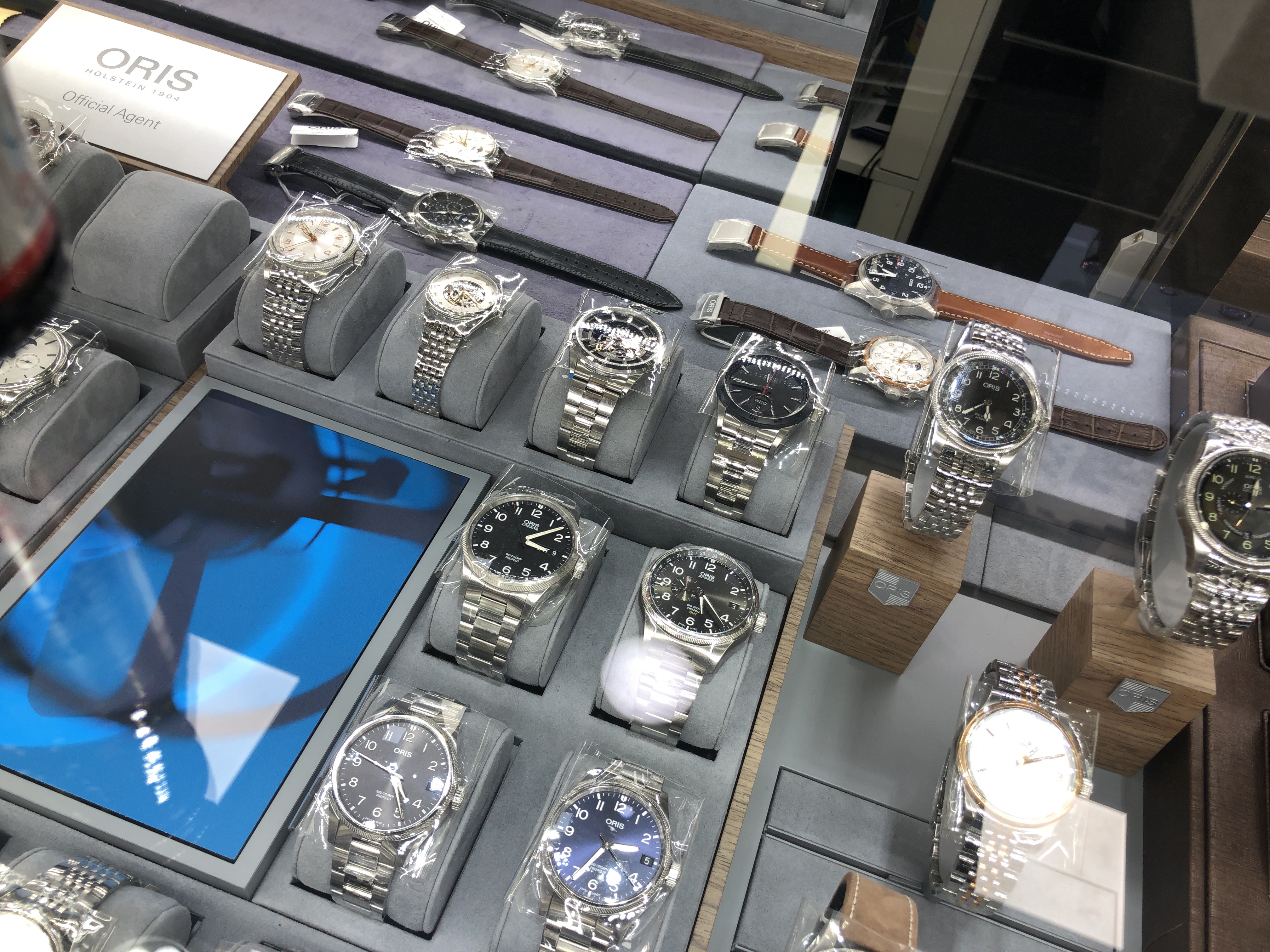 오리스 시계 진열. 애커스 라인 제품들을 볼 수 있다.