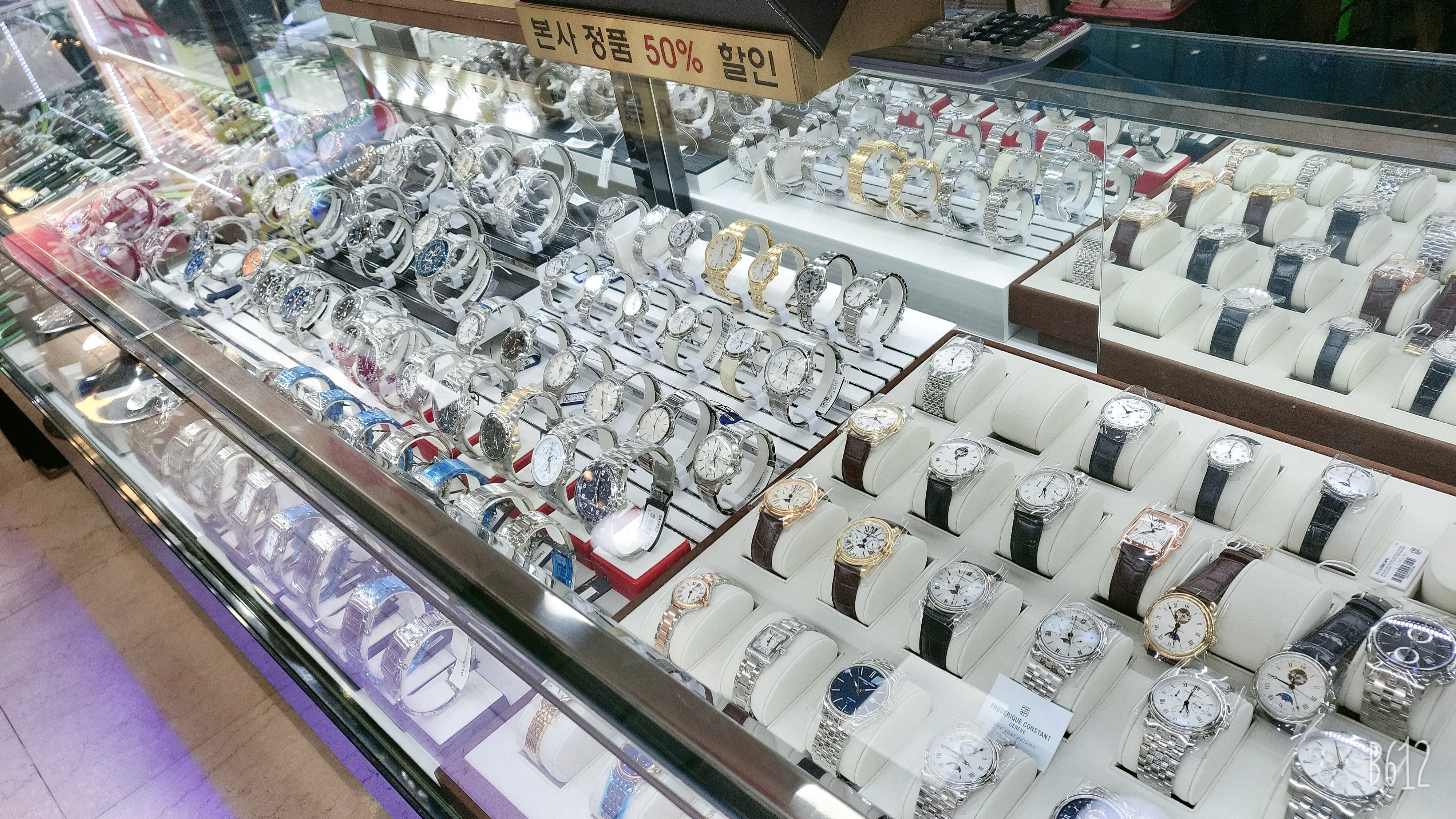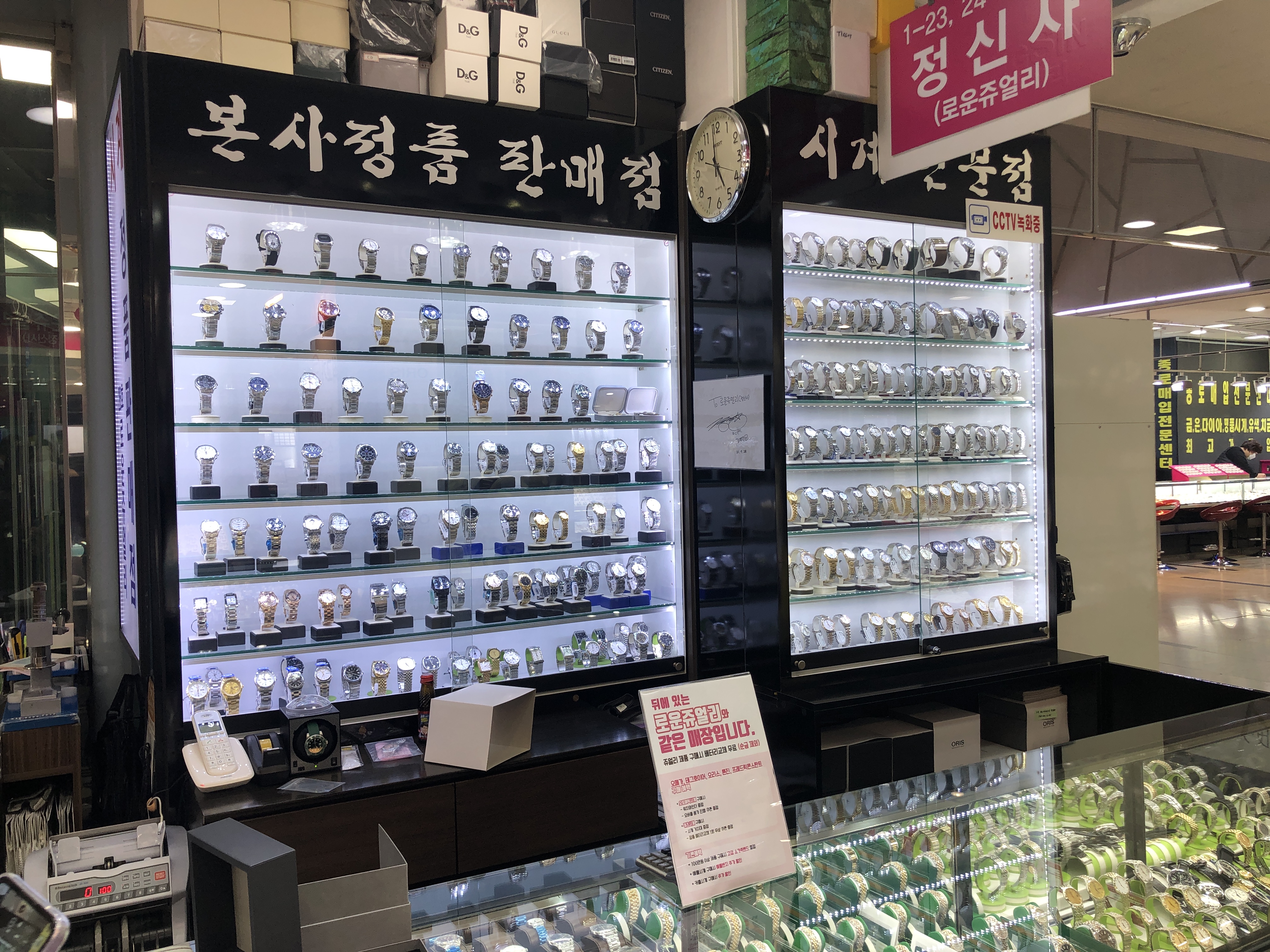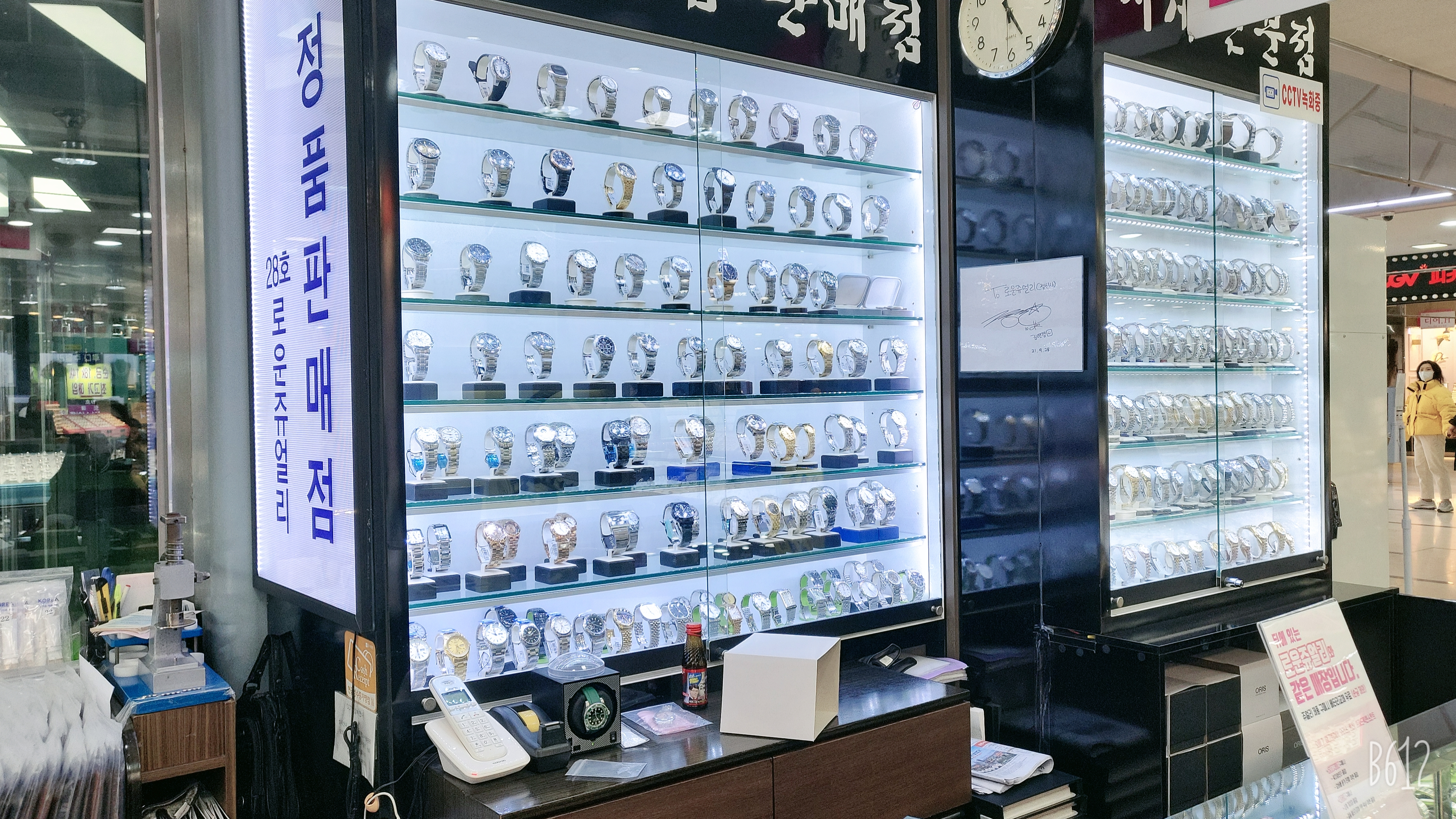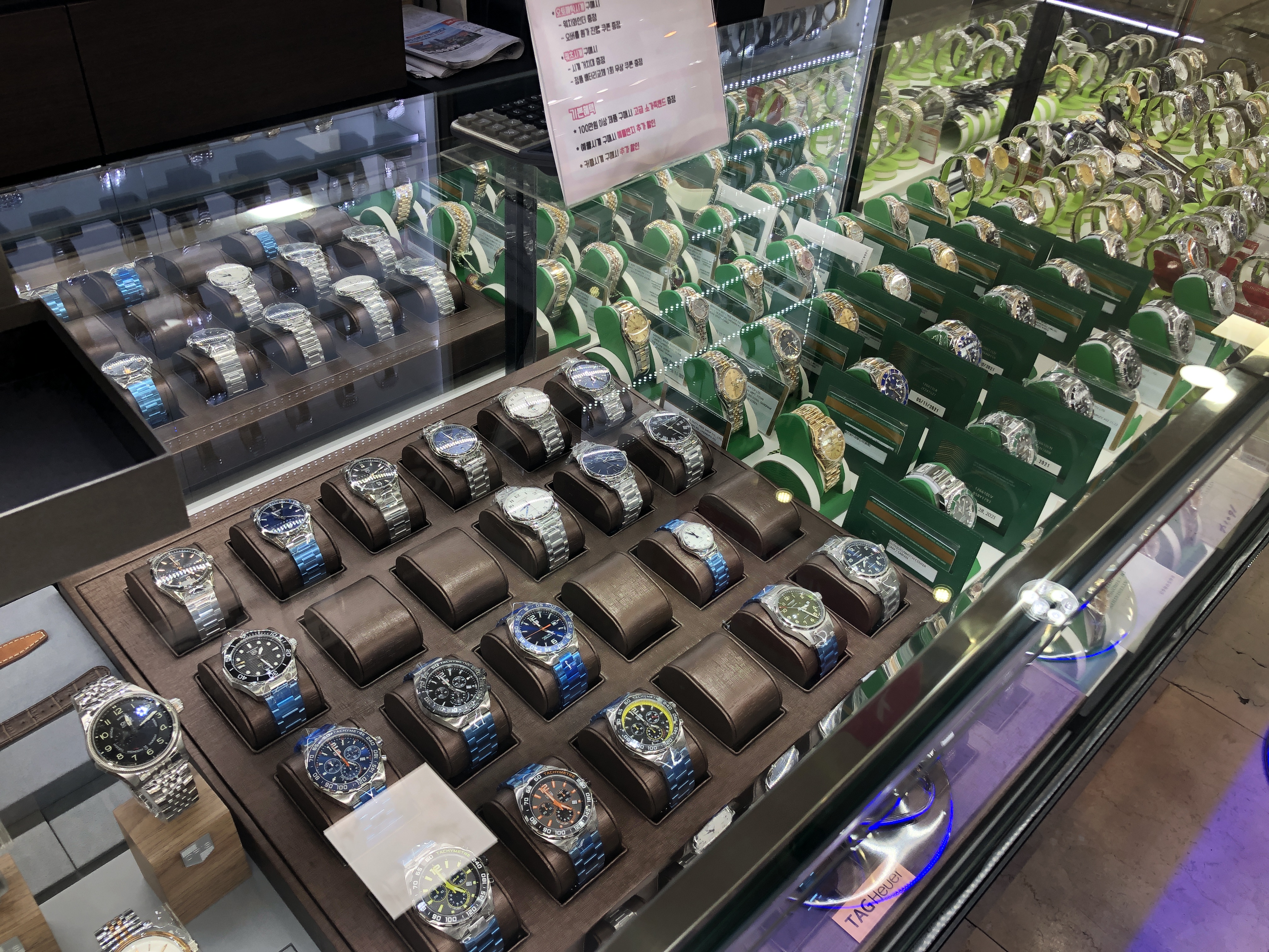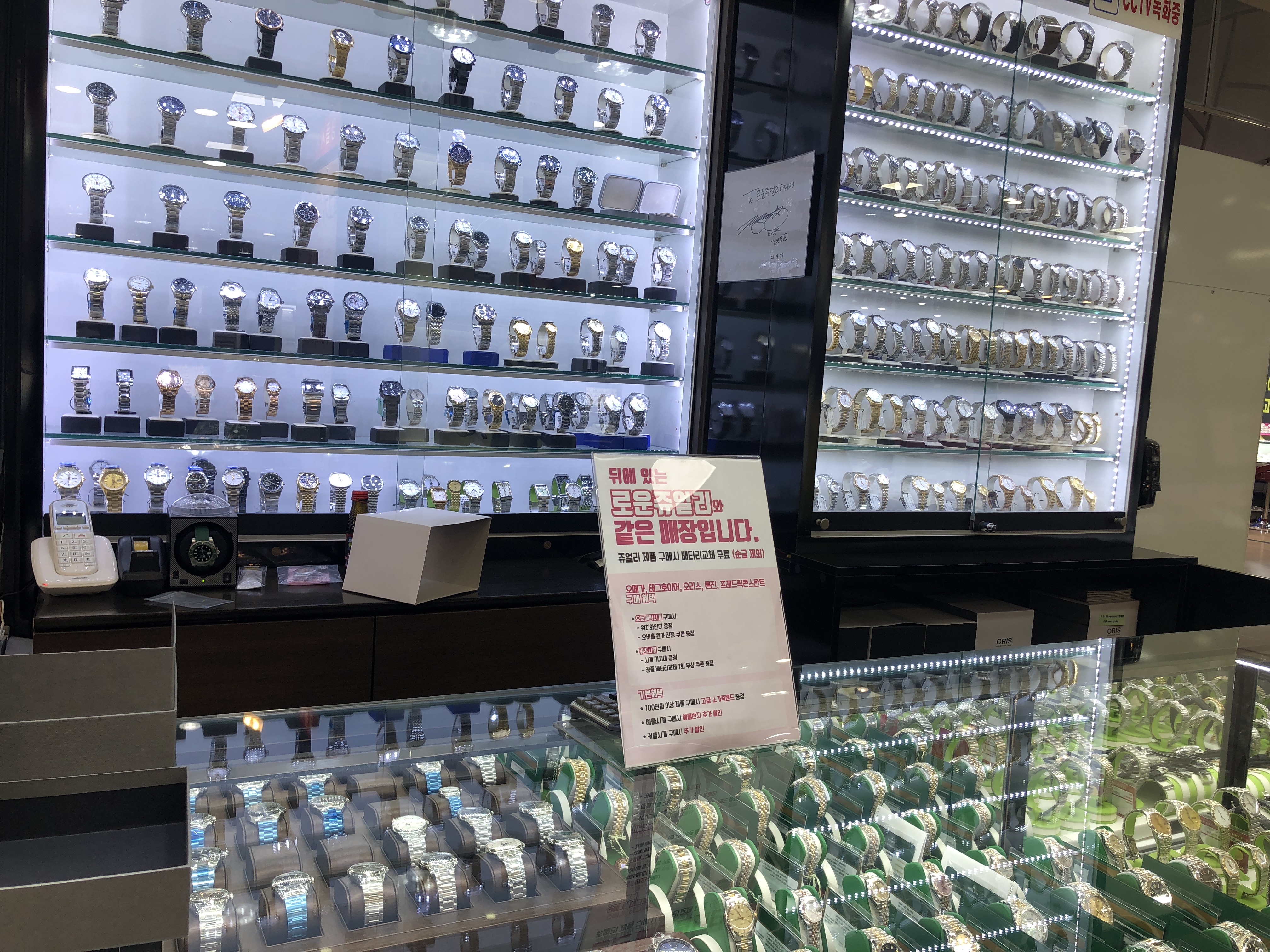 쇼케이스 진열장에 있던 시계들. 롤렉스는 중고라고 하는데, 아래 사진처럼 연두색, 초록색으로 된 시계들은 중고라는 것이고 나머지 상품들은 새상품이라고 했다.